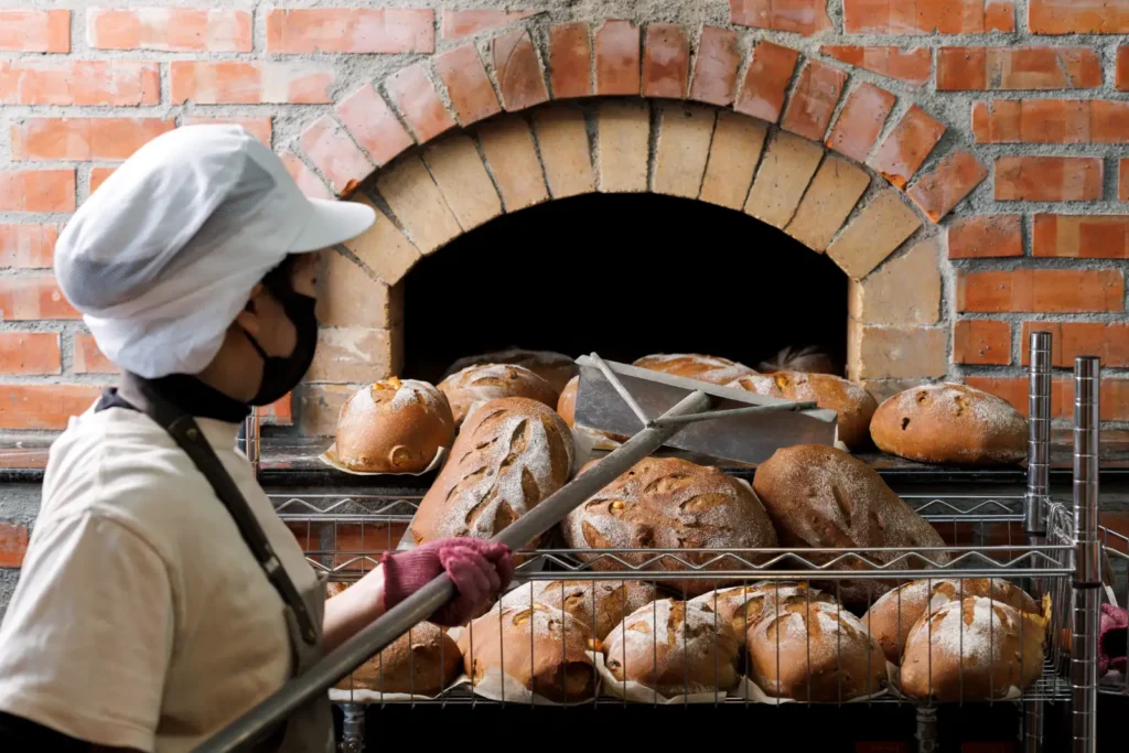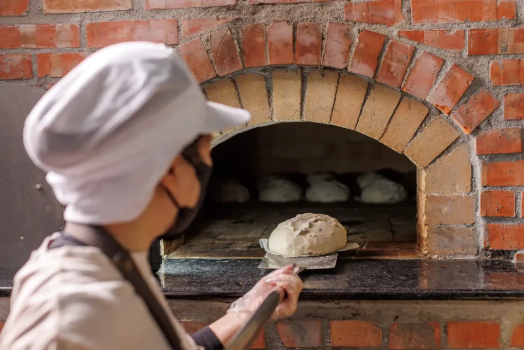 將麵糰送入窯中,火與磚壁釋放的遠紅外線熱能迅速讓外皮焦糖化,形成香脆外殼,內部水分被鎖住保留柔軟。